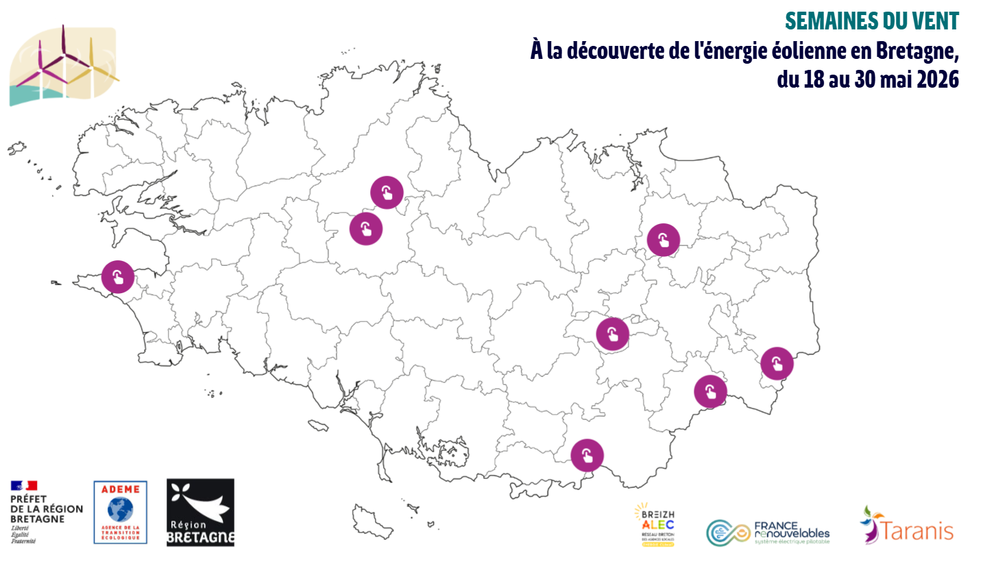 Du lundi 18 mai 2026 au samedi 30 mai 2026 retrouvez 8 parcs éoliens sur toute la Bretagne, dont deux parcs éoliens citoyens :